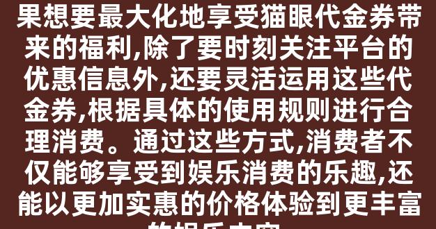 首先,要想充分利用猫眼代金券,牡丹江的消费者需要时刻关注平台的各种优惠信息。猫眼平台常常会发布不定期的促销活动或者限时优惠,这些信息如果能够及时获取,就能在合适的时机购买票务或其他娱乐产品,从而享受更大的折扣。通过关注猫眼的官方网站、社交媒体账号或应用中的通知,消费者可以第一时间掌握最新的代金券发放和使用规则。